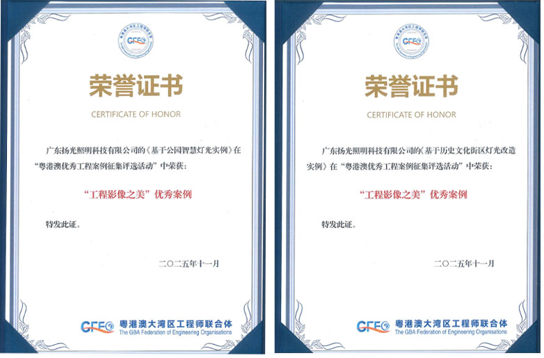 2025年11月30日,由中國工程師聯(lián)合體指導(dǎo),粵港澳大灣區(qū)工程師聯(lián)合體、中國科技發(fā)展基金會、香港工程院等單位聯(lián)合舉辦的第四界大灣區(qū)工程師論壇及大灣區(qū)優(yōu)秀工程頒獎儀式在廣州華南理工大學(xué)國際校區(qū)隆重舉行。在此次評選中,揚光照明憑借“東莞記憶首開區(qū)歷史文化街區(qū)燈光工程項目”及“東莞科學(xué)公園智慧燈光項目”雙雙榮獲“工程影像之美”優(yōu)秀案例稱號,彰顯企業(yè)在照明工程領(lǐng)域卓越的技術(shù)實力與美學(xué)追求。